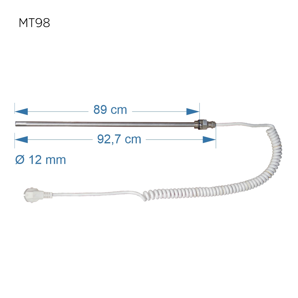 Elektrická vykurovacia tyč bez termostatu slúži k vyhrievaniu kúpeľňových radiátorov – rebríkov. Vykurovacia tyč po zapnutí telesa do zásuvky nemá žiadnu reguláciu ani termostat a hreje pokiaľ ju nevypnete. Termostat pod označením MT99 je možné zakúpiť samostatne. Dĺžka káblu u vykurovacej tyče je 120 cm a je zakončená vidlicou s ochranným kolíkom.