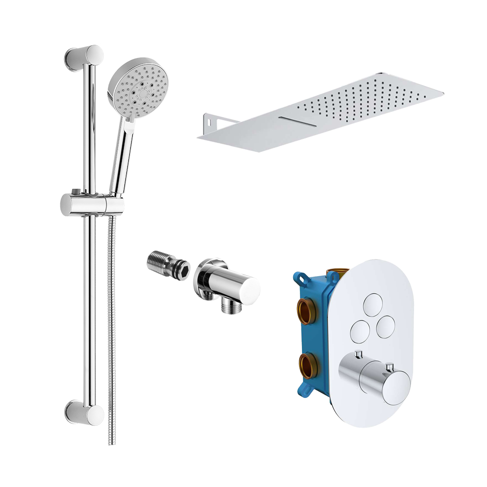 Súčasťou setu je tanierová sprcha s vodopádom 500×200 mm, posuvný držiak, päťpolohová sprcha, nerezová hadica so systémom zabraňujúcim prekrúteniu, 150 cm, stenový vývod.