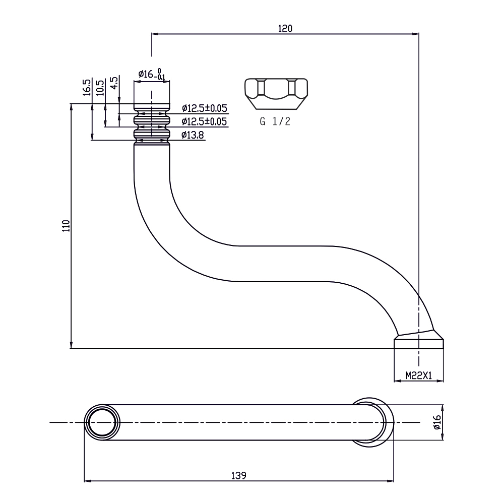 Ramienko rúrkové s pripojovacou maticou 1/2″ o celkovej dĺžke 120 mm. Ramienko je vyrobené z kvalitnej pochrómovanej mosadze. Ramienko je určené pre nízkotlakové batérie CBS301001M.